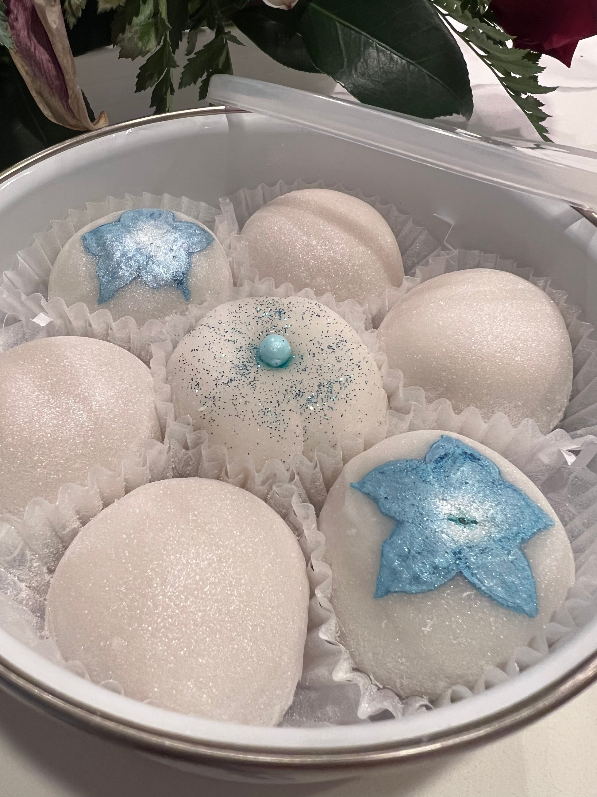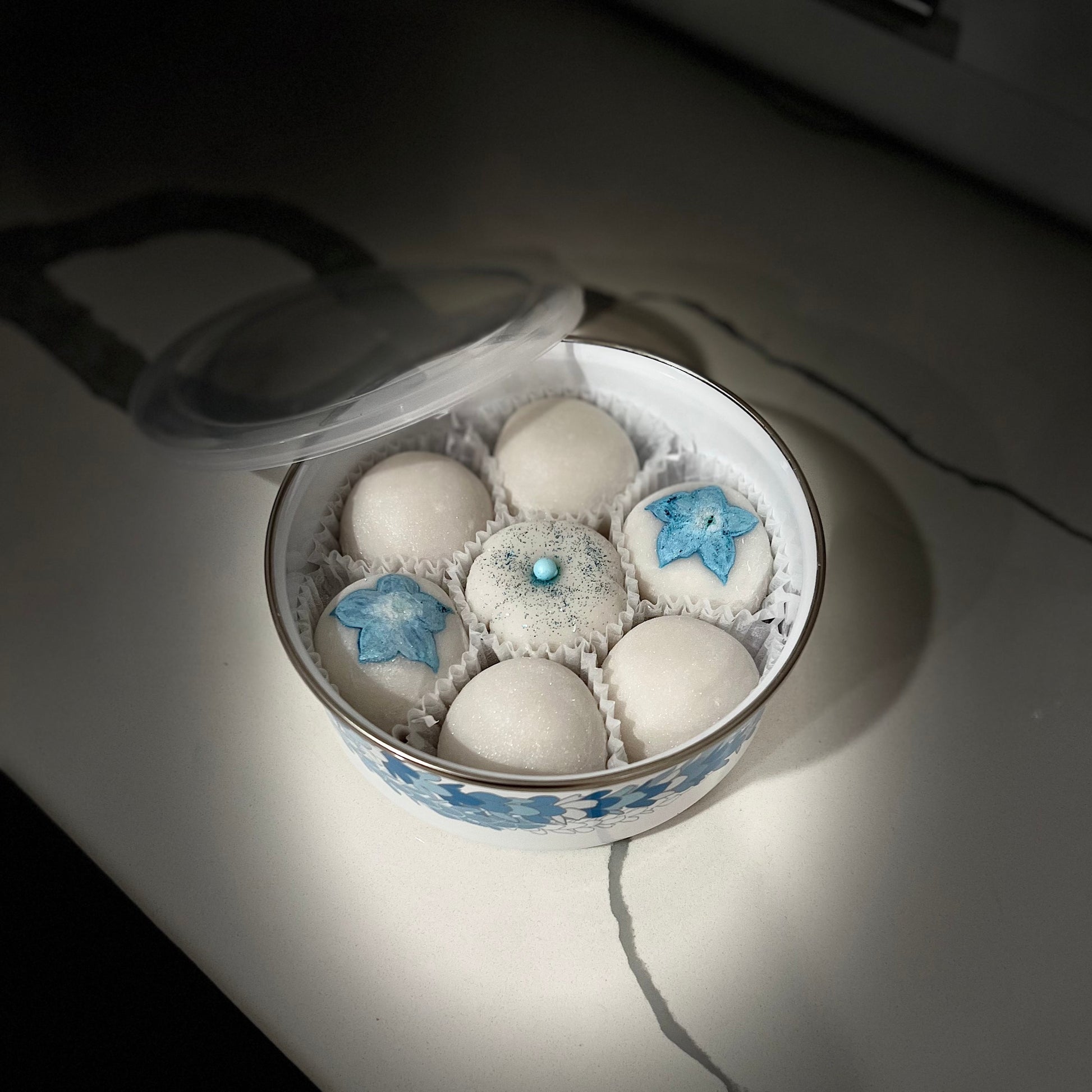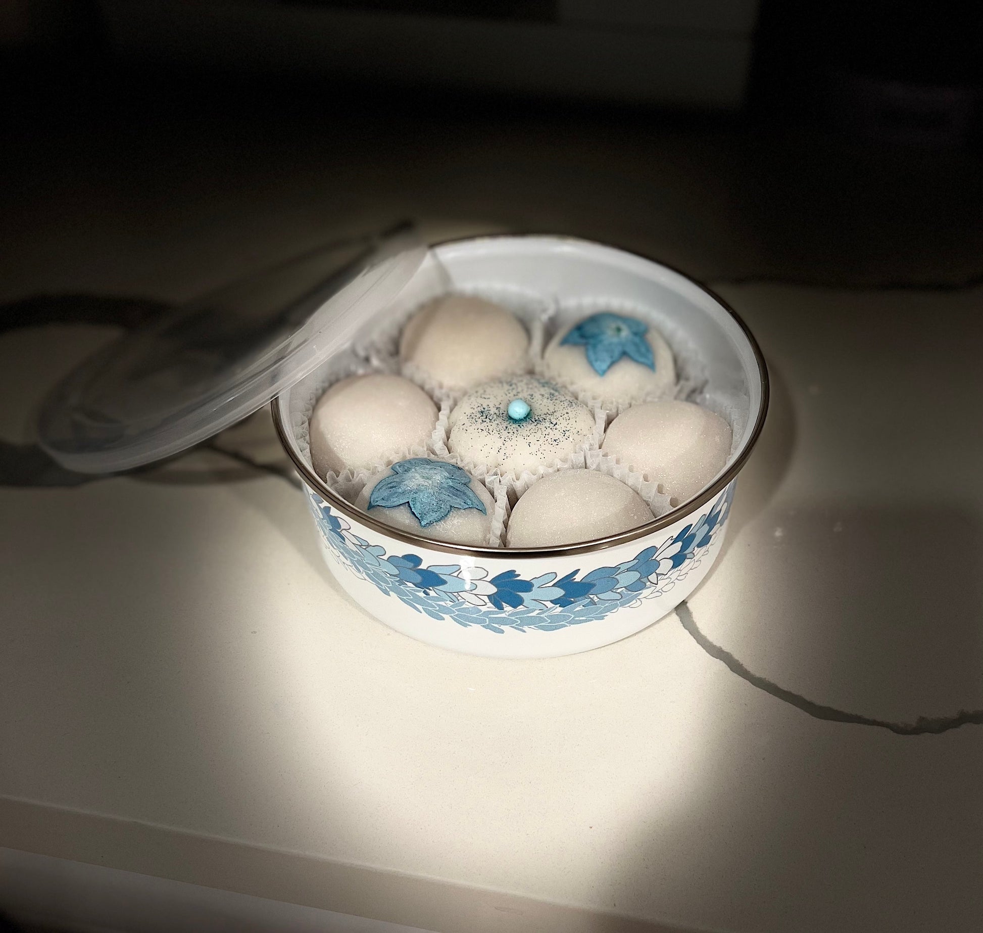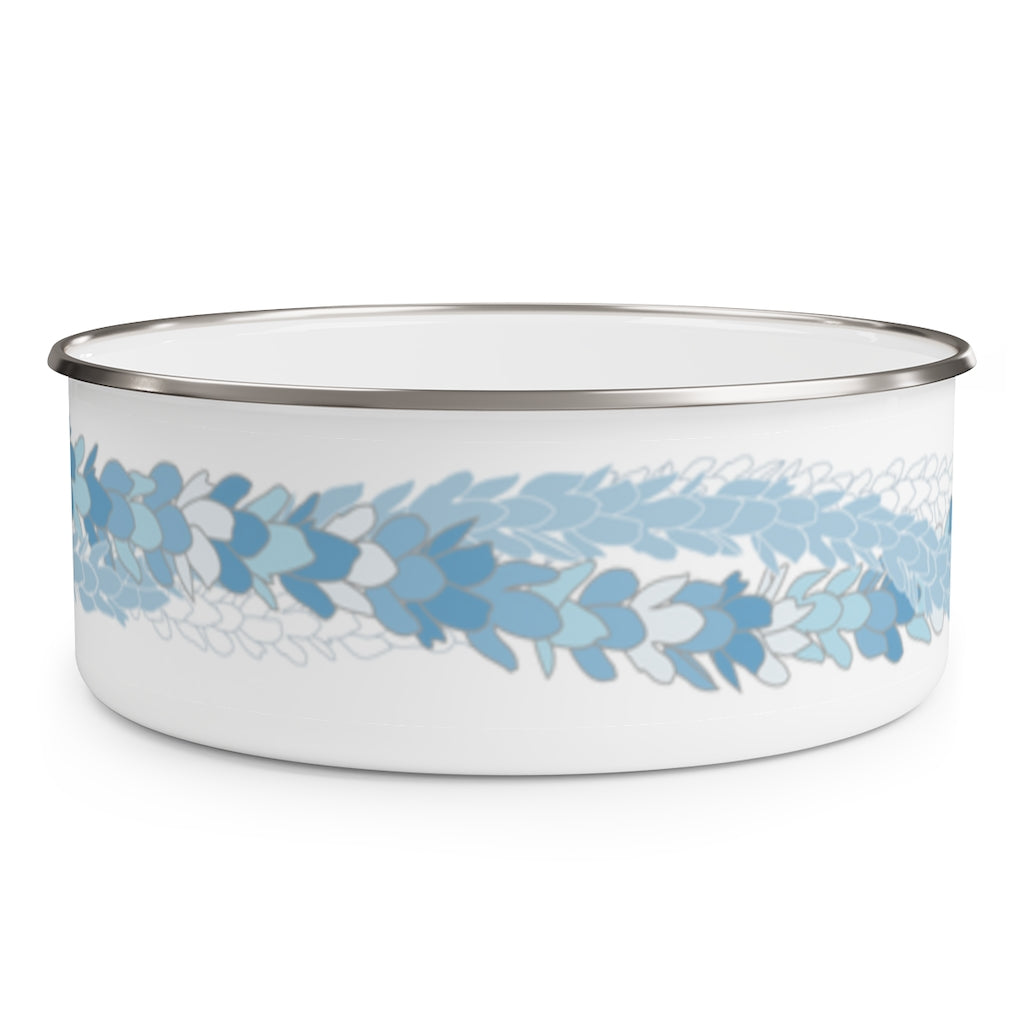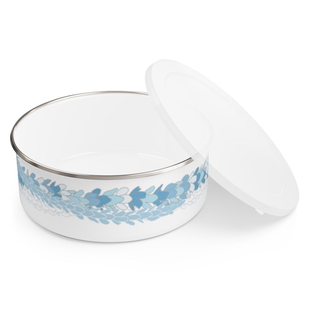 A special edition Pakalana flower lei on a 30 oz enamel bowl containing 7 decadent and FRESHLY made pieces of Jujumochi’s famous stuffed mochi (decoration may vary). Container has a matching plastic lid useful for storing snacks, dips and even small knick knacks!