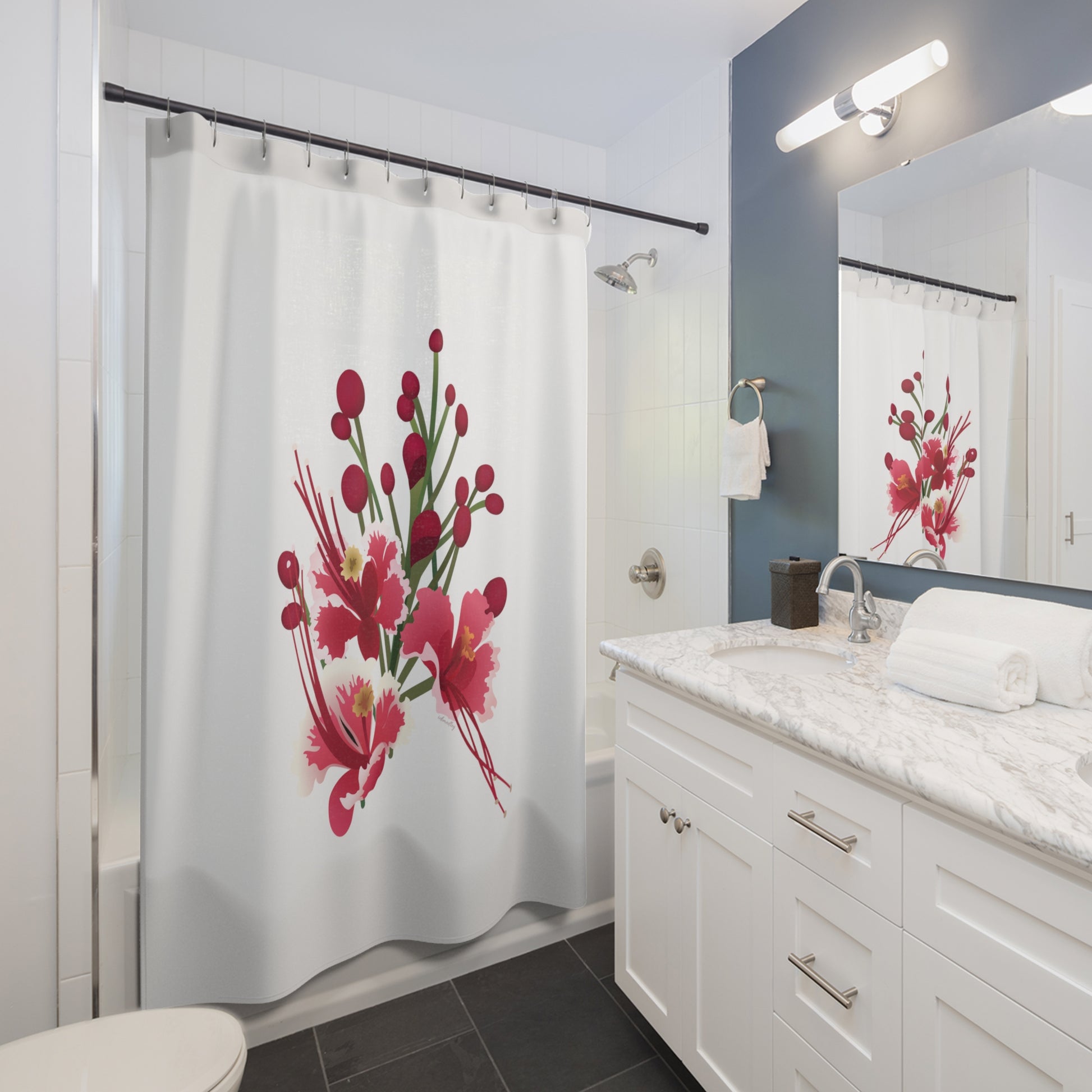 Liven up your most intimate personal space with stunning, near photo quality shower curtains! Sheer, delicate fabric that holds shape and hangs well, near wrinkle-free. Reinforced stitched openings.